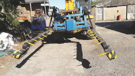 Kent livestock farmer Hugh Richards collects 1,500 small square bales a year from grain fields.  He couldn't justify the cost of a big bale accumulator so he built this big bale grabber for his telehandler.