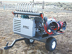 The PERC 412 model is a 4-hose, trailer-mounted unit with ATV tires and a 13 hp gas engine, while the "PERC 206," is a 2-hose, skid-mounted unit with a 6.5 hp gas engine. Both are made to pull behind an ATV, and leave no tracks in growing crops or on golf courses or parks.