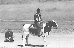 "Cow jockey" Brian D. Nielsen of Mason, Mich., rode Taffy, a three-year-old Holstein cow, to an exciting finish. Nielsen and his "steed" completed the one mile race in eight minutes, 55 seconds, outdistancing five other "racecows".