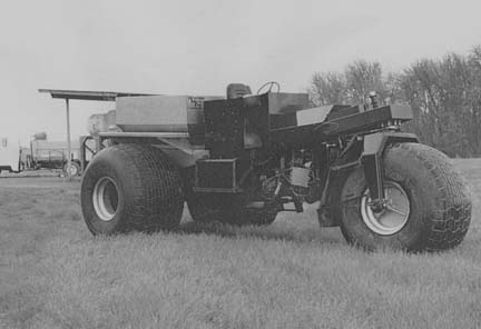 It rides on 66-in. high, 44-in. wide flotation wheels and can be used either as a fertilizer spinner spreader (equipped with a 4,200-lb. capacity steel hopper) or as a sprayer (equipped with a 500-gal. plastic tank and 60-ft. boom). A hydraulic pump driven off the engine crankshaft raises and lowers the boom and also operates the sprayer pump.