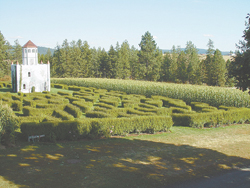The hedge maze is located between two corn mazes. Putting rails and ropes across different paths changes the maze pattern. The four-story "castle" in the middle offers a spectacular view of the Siemers farm with a mountain backdrop that includes Mount Spokane.