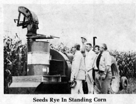 That Rube Goldberg type invention shown in the accompanying photo is a forage harvester converted to a seeder for sowing rye in standing corn.